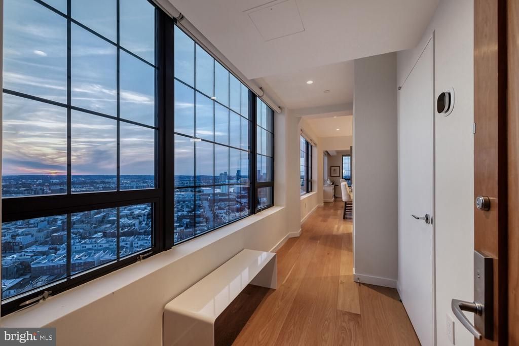 Experience unparalleled luxury living in this architecturally unique corner condominium located on the 18th floor of the iconic Silo Point. Enjoy panoramic and unobstructed water and city views from triple exposures in this highly sought-after two-bedroom, two-and-one-half-bath Tower residence. Offering over 2,200 square feet of refined, one-level living, this reimagined home captures dramatic skyline and harbor views from every angle. Masterfully redesigned by architect Mitchell Owen of MOD Group and executed to perfection by Greenleaf Construction, the residence underwent a full transformation in 2023; including all-new HVAC, plumbing, lighting, and top-of-the-line appliances. The result is a striking blend of industrial heritage and modern luxury, anchored by original concrete columns from the building’s historic grain elevator past. Walls of glass facing west, north, and east flood the space with natural light, framing breathtaking vistas across the city and water. A private east-facing balcony offers the perfect setting for a morning espresso or an evening wind-down. Inside, Carlisle heirloom white oak floors run throughout, setting the stage for rich, custom walnut built-ins that elevate both the kitchen and living areas. The chef’s kitchen is a centerpiece of the home meticulously designed with oversized Caesarstone quartz countertops, custom soft-close walnut cabinetry, and a fully integrated appliance suite that includes a Sub-Zero refrigerator, Wolf induction cooktop with ceiling-mounted hood, Wolf E-series oven and speed oven, and a Miele dishwasher with automatic detergent dispenser. A beautifully integrated custom coffee station adds functionality and flair, making daily rituals feel indulgent and effortless. The serene primary suite features balcony access, a spacious walk-in closet with custom organization, and a spa-inspired en-suite bath adorned with Dornbracht and Toto fixtures, a freestanding Victoria & Albert Amiata soaking tub, and a quartz double vanity. The equally spacious guest bedroom includes its own en-suite bath, offering privacy and comfort for visitors. Additional features include a beautifully finished powder room, a full-size LG washer and dryer with additional storage, Lutron motorized blinds, and upgraded lighting throughout. Two deeded garage parking spaces convey. Residents at Silo Point enjoy a full-service lifestyle, including a 24-hour front desk concierge, on-site building management, a state-of-the-art fitness center with yoga studio and private treatment room, game room, boardroom, and the show-stopping 19th Floor Sky Lounge with panoramic views. Originally constructed as a 1920s grain elevator, Silo Point has been transformed into one of Baltimore’s most architecturally iconic residential communities—offering an unmatched blend of bold design, luxury amenities, and exceptional waterfront living.